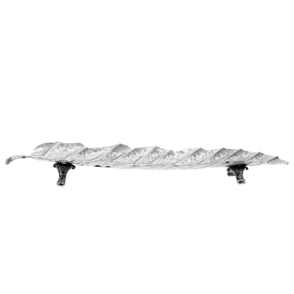 Декоративное блюдо из металла, выполненное в форме вытянутого листа. Рельефные диагональные прожилки и легкая «мятая» текстура создают эффект ручной ковки. Серебристый оттенок с деликатной патиной красиво играет на свету. Края слегка приподняты, кончик листа изящно загнут. Изделие стоит на трех миниатюрных фигурных ножках с растительным орнаментом, что придает устойчивость и легкость. Подходит для подачи фруктов, конфет и канапе или как акцентное декоративное блюдо на консоли, журнальном столике, в прихожей для мелочей и украшений. Органично впишется в классические и современные интерьеры.