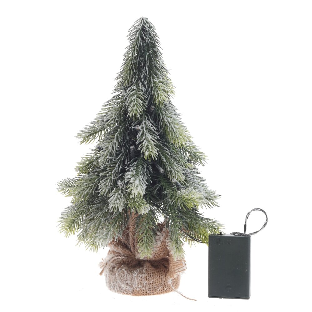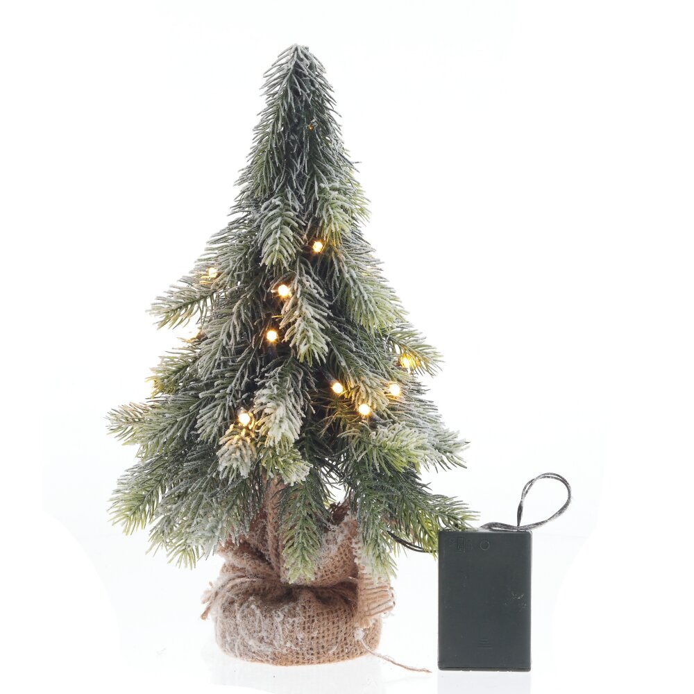 Декоративное изделие с подсветкой "Елка" привнесет уют и атмосферу праздника в ваш дом. Эта искусственная елочка, основание которой декорировано холщовой тканью выглядит очень натуралистично, как будто вы принесли частичку леса в свой интерьер. Веточки слегка припорошены инеем и декорированы гирляндой с теплым белым светом, создавая мягкое освещение. Питание осуществляется от трех батареек типа АА (в комплект не входят).