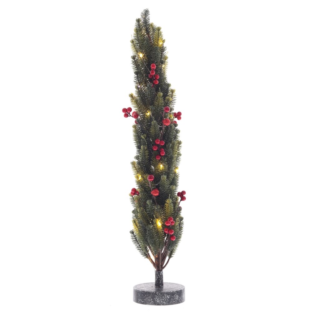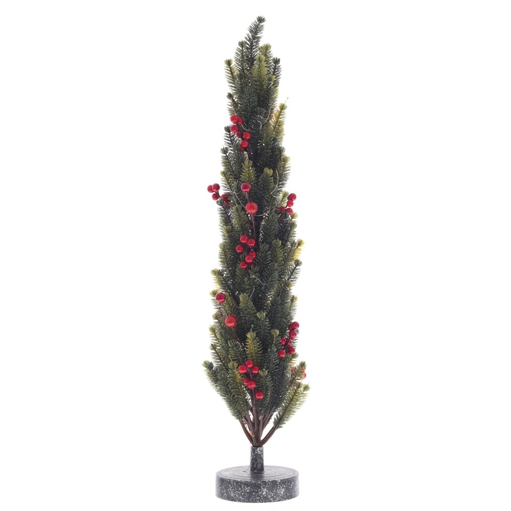 Декоративное изделие с подсветкой "Елка" – это изящная искусственная елочка, установленная на круглой подставке. Елка украшена веточками с красными ягодами, что создает праздничное настроение. Она дополнена гирляндой с мягким теплым светом, что придаёт интерьеру уют и атмосферу праздника. Это изделие работает от трех батареек типа AA (в комплект не входят), что позволяет легко размещать елочку в любом месте. Идеально подходит для новогодних декораций в доме или офисе.