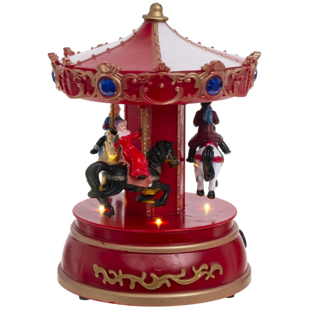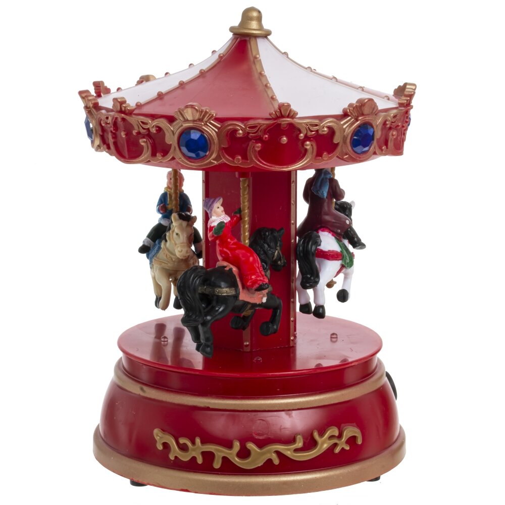 Карусель выполнена в ярких тонах, приковывающих к себе внимание. Резной купол украшен интересным орнаментом, на лошадках сидят веселые дети. Фигурка декоративная с подсветкой и функцией движения "Карусель", изготовлена из полимерных материалов. Работает от трех батареек АА (не прилагаются). Шнур питания Кабель USB 150 см входит в комплект.