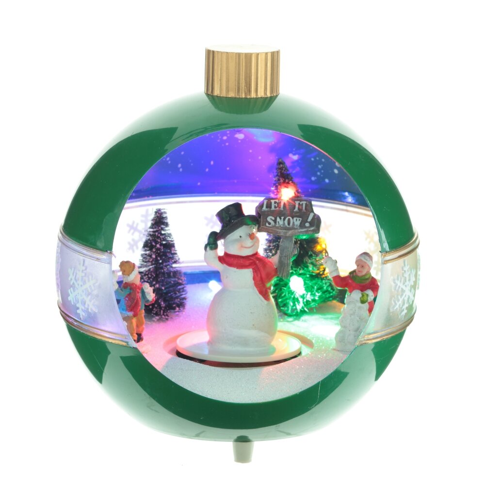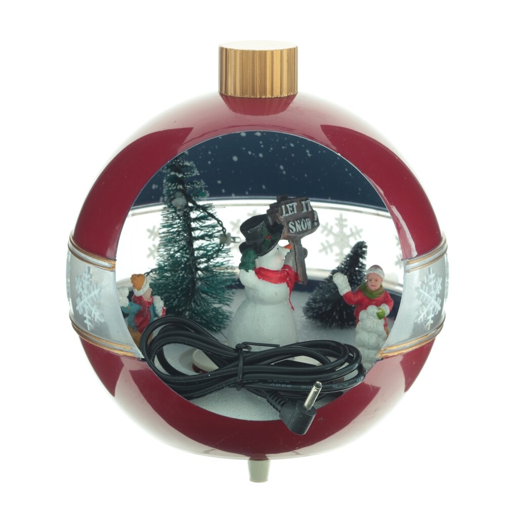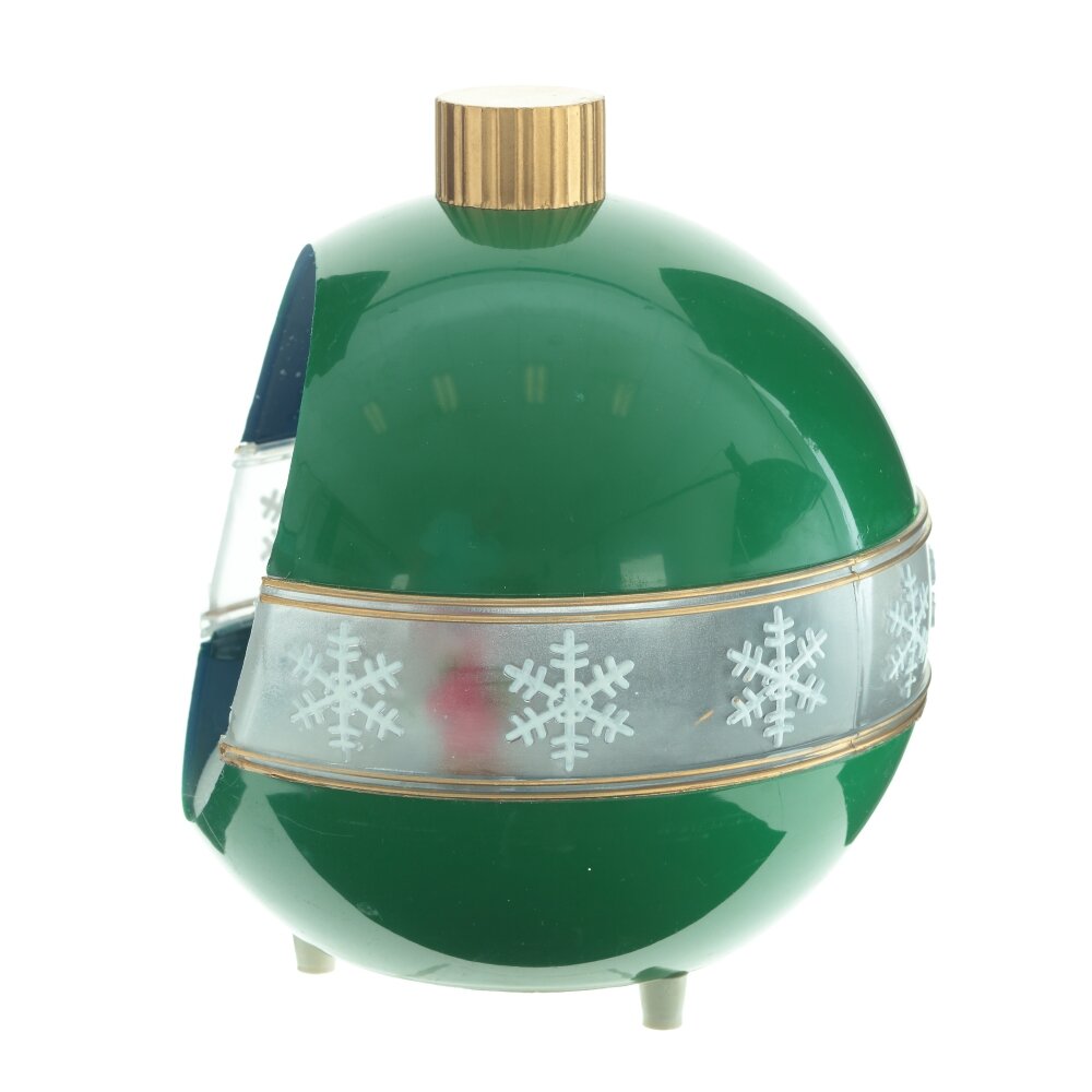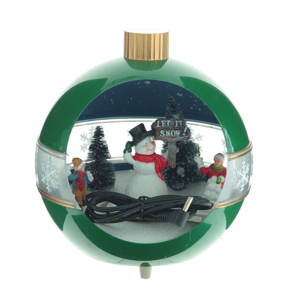Новогодняя фигурка с подсветкой, музыкой и функцией движения выполнена в форме елочной игрушки, внутри которой расположены яркие новогодние персонажи. Работает от 3-х батареек АА (не прилагаются), а также от шнура питания Кабель USB 98.5 см, который входит в комплект. Изделие представлено в двух вариантах.