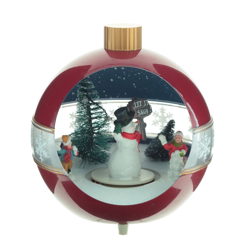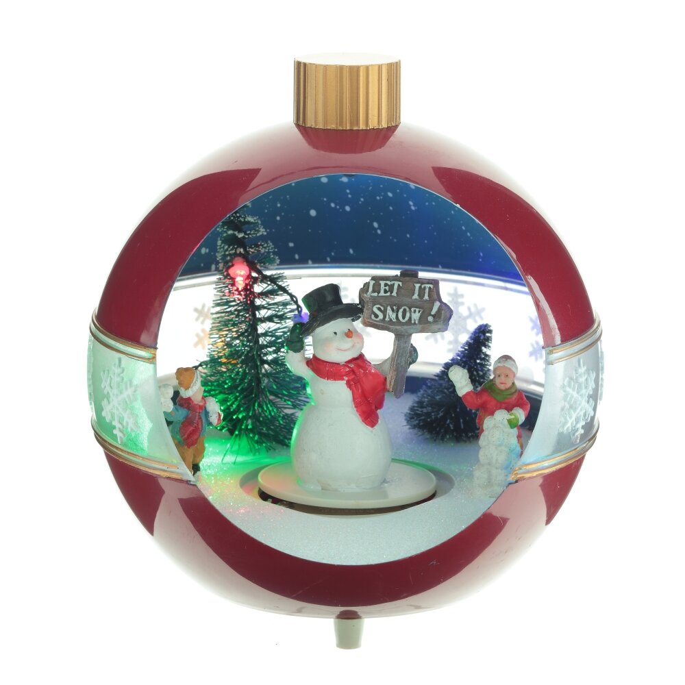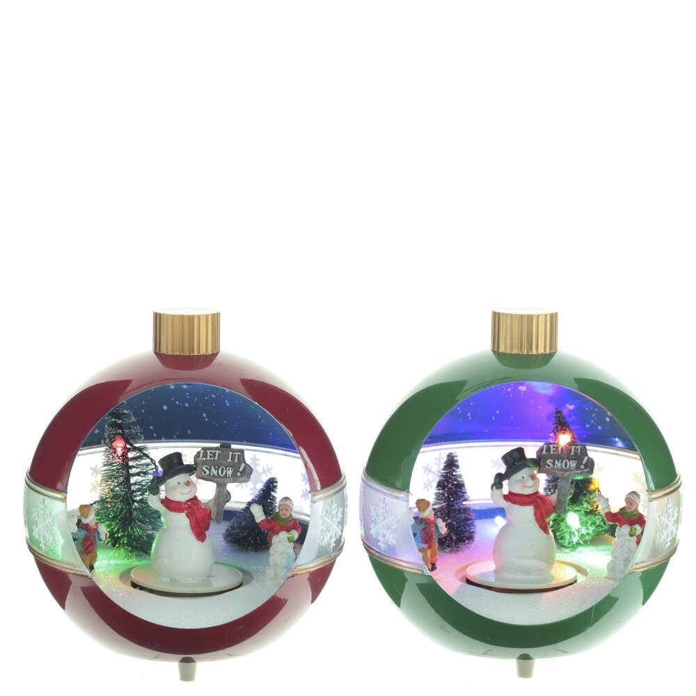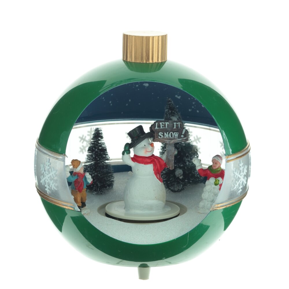 Новогодняя фигурка с подсветкой, музыкой и функцией движения выполнена в форме елочной игрушки, внутри которой расположены яркие новогодние персонажи. Работает от 3-х батареек АА (не прилагаются), а также от шнура питания Кабель USB 98.5 см, который входит в комплект. Изделие представлено в двух вариантах.