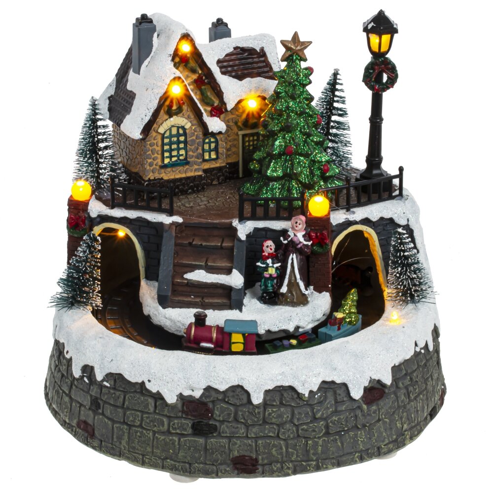 Веселые огоньки, забавный домик, фонари, елки и новогодний паровозик. Хотите, чтобы наступающий год был ярким, полным веселых чудес? Тогда эта оригинальная миниатюра для вас. Фигурка музыкальная, с подсветкой и функцией движения. Работает от трех батареек АА (не прилагаются). Шнур питания Кабель USB 100 см входит в комплект.