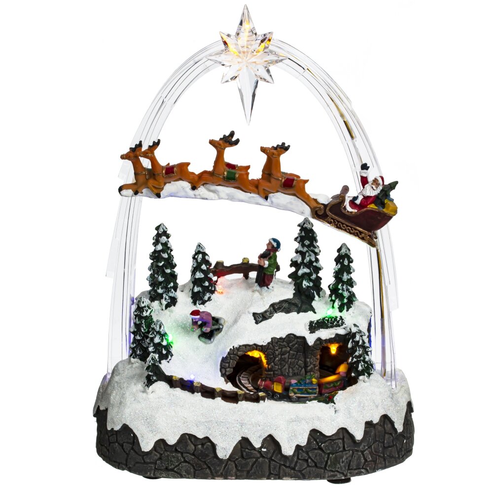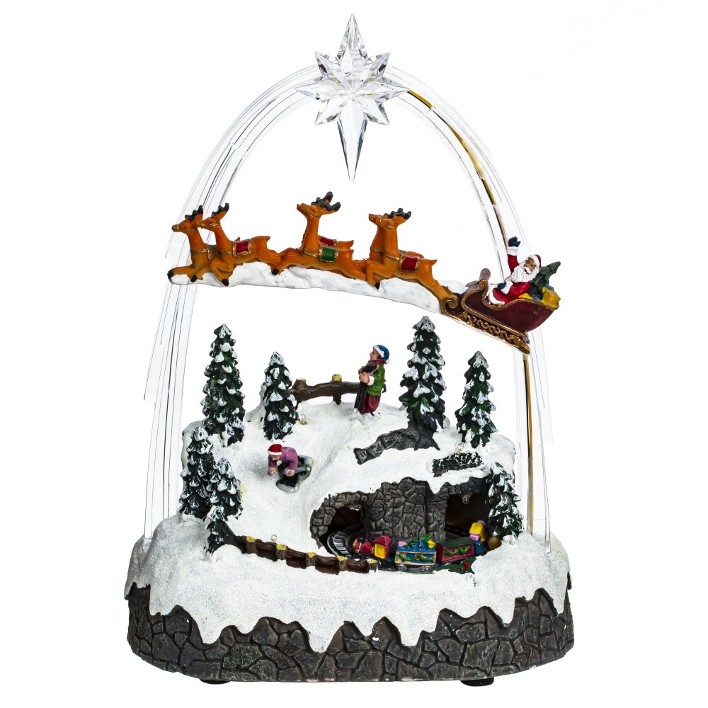 Новогодняя музыкальная композиция с подсветкой станет прекрасной декорацией к новогоднему убранству. Миниатюра демонстрирует сценку из жизни маленького городка, жители которого готовятся к встрече зимних праздников. Сияющие огоньки, движущиеся элементы и веселая музыка помогут композиции стать самой заметной частью праздничного декора. Работает от трех батареек АА (не прилагаются) и шнура питания Кабель USB 81.5 см, который входит в комплект.