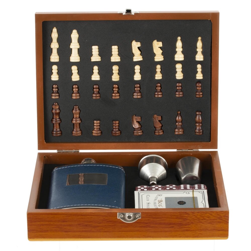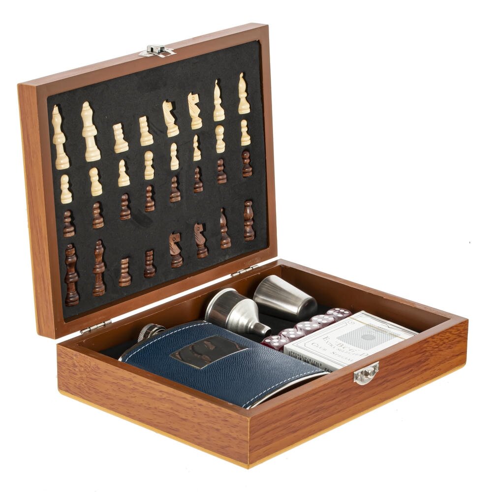 Набор подарочный (фляжка 220 мл, шахматы, покер карты, игр. кости, воронка, стопка 30 мл), L24 W19 H