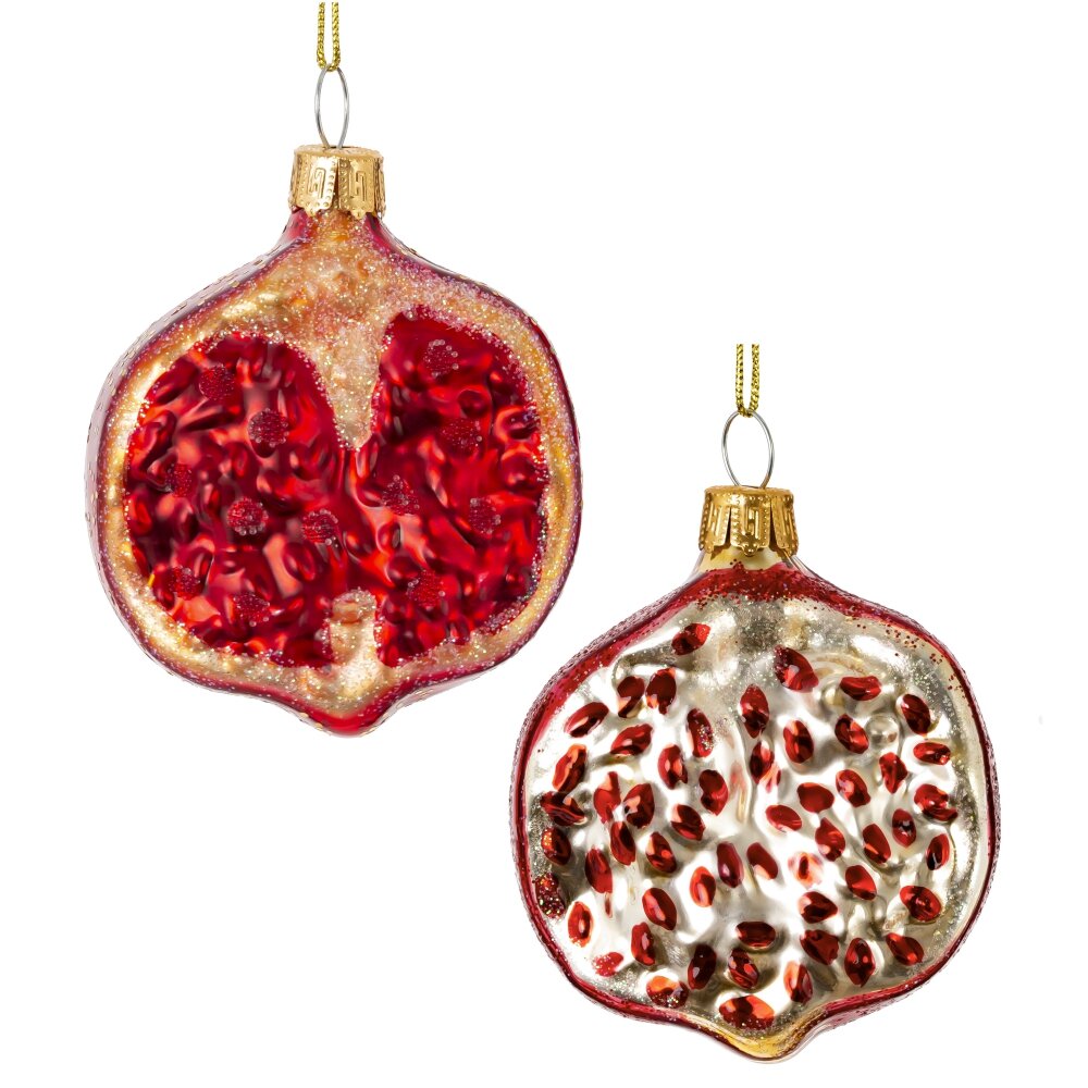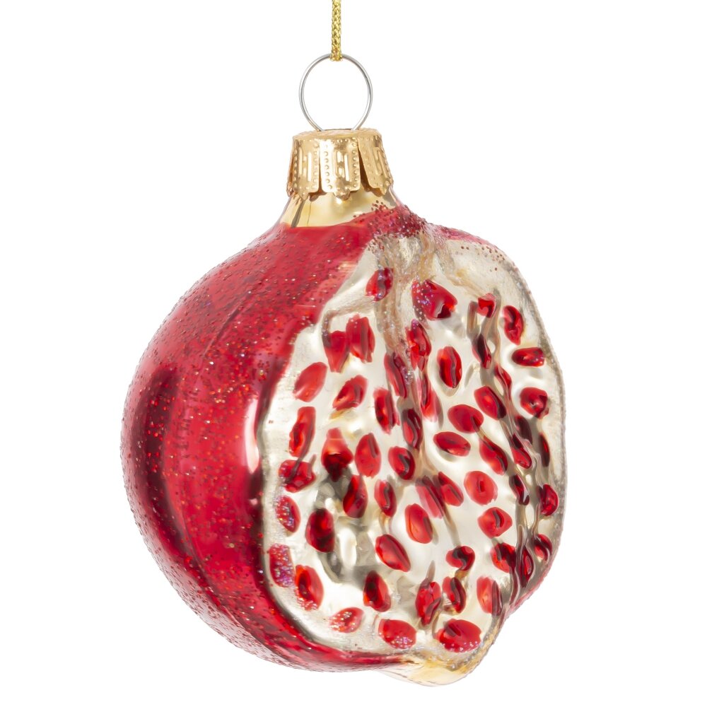 Елочное украшение из стекла в виде граната — это изысканный и символичный элемент новогоднего декора, олицетворяющий изобилие, плодородие и благополучие. Выполненное вручную из тонкого стекла, украшение отличается насыщенным бордовым или тёмно-красным цветом с глянцевым блеском, который придаёт ему реалистичный и праздничный вид. Форма граната тщательно проработана: рельефная поверхность напоминает кожуру настоящего плода, а верхушка оформлена в виде декоративной короны с золотистыми или серебристыми акцентами. Некоторые модели могут быть стилизованы с открытым «надрезом», сквозь который виднеются стеклянные зёрна — сверкающие капельки, напоминающие рубины. Такое украшение не только украсит ёлку, но и станет символом процветания и удачи в новом году.
