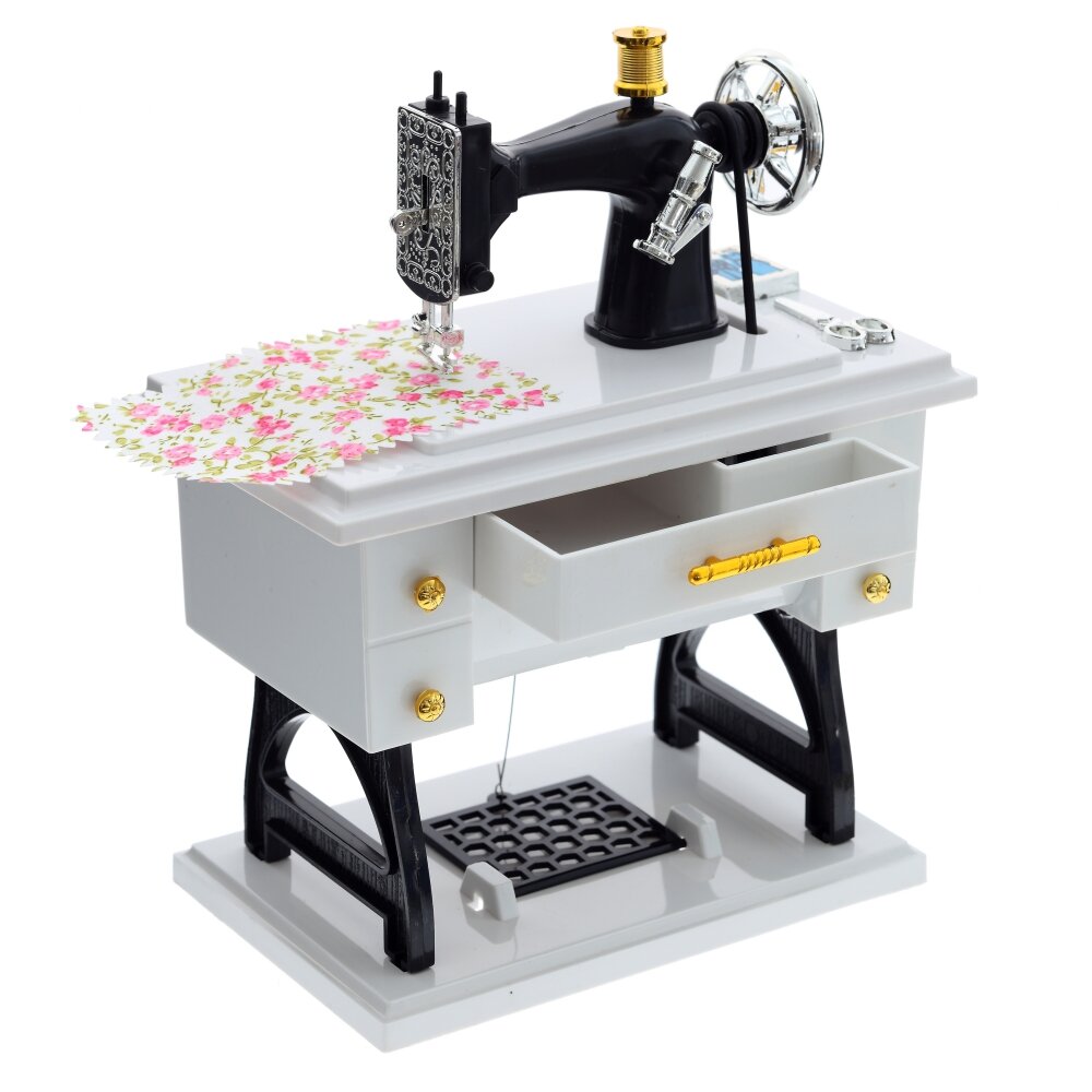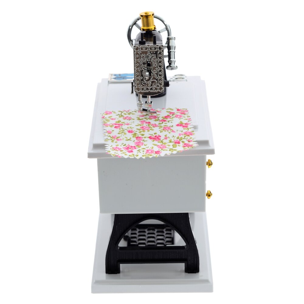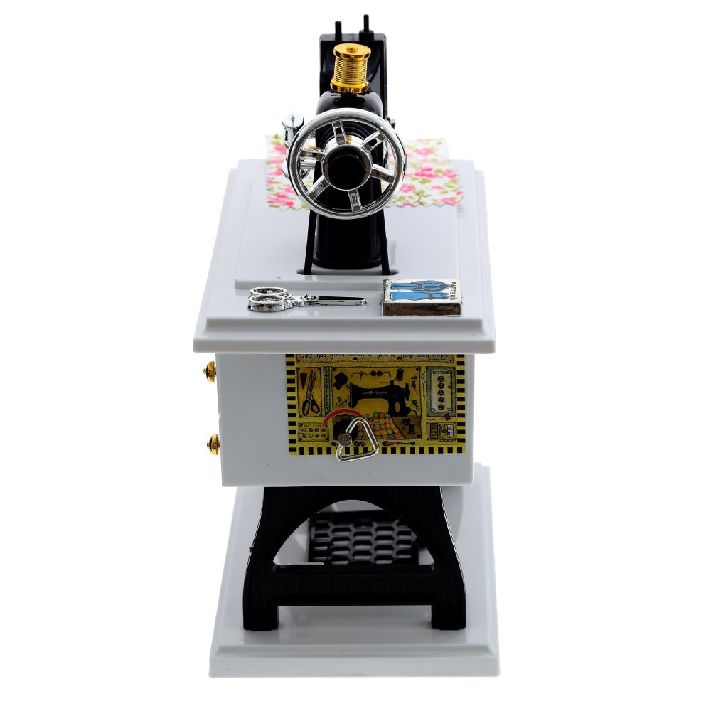 Декоративная миниатюра «Швейная машинка» — музыкальное интерьерное изделие в винтажном стиле. На белой тумбе расположена черная машинка с узорной фронтальной панелью, блестящим маховиком и ножной педалью; на столешнице лежит лоскут цветочной ткани. Золотистая фурнитура подчеркивает изящество модели. Изделие оснащено заводным ключом: заведите механизм и откройте выдвижной ящик — зазвучит нежная мелодия, а колесо и игла начнут плавно имитировать работу. Такая музыкальная миниатюра добавит уюта в гостиную, мастерскую или детскую, станет оригинальным подарком для любителей шитья и коллекционеров необычных аксессуаров.