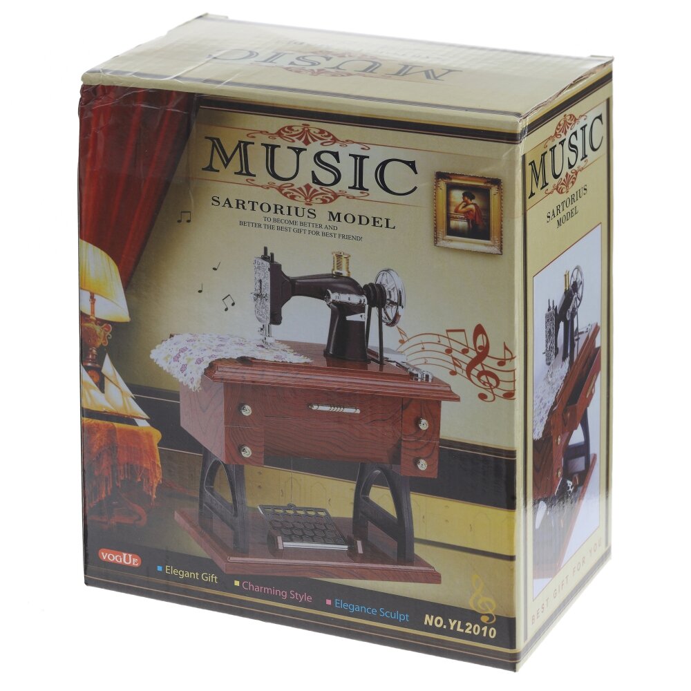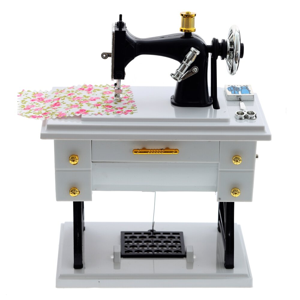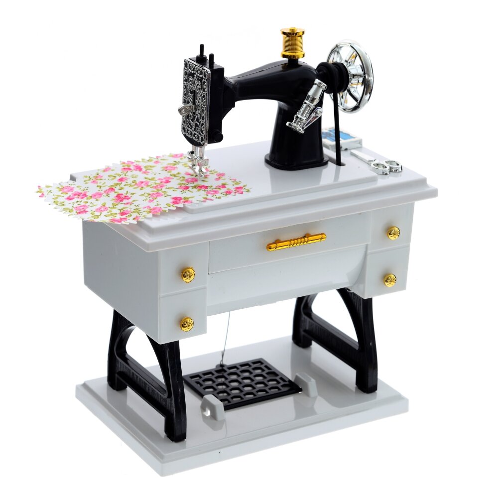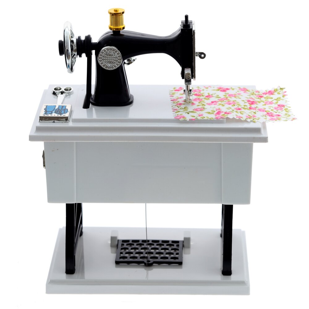 Декоративная миниатюра «Швейная машинка» — музыкальное интерьерное изделие в винтажном стиле. На белой тумбе расположена черная машинка с узорной фронтальной панелью, блестящим маховиком и ножной педалью; на столешнице лежит лоскут цветочной ткани. Золотистая фурнитура подчеркивает изящество модели. Изделие оснащено заводным ключом: заведите механизм и откройте выдвижной ящик — зазвучит нежная мелодия, а колесо и игла начнут плавно имитировать работу. Такая музыкальная миниатюра добавит уюта в гостиную, мастерскую или детскую, станет оригинальным подарком для любителей шитья и коллекционеров необычных аксессуаров.