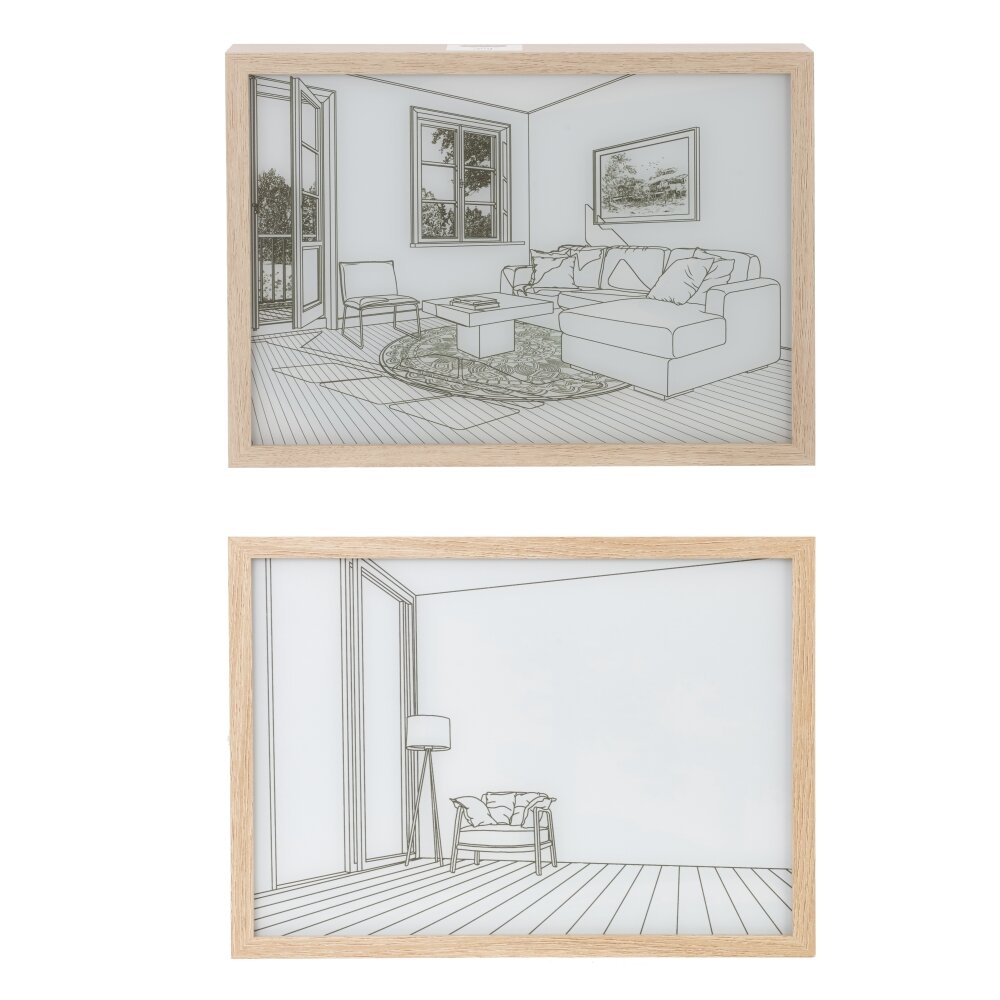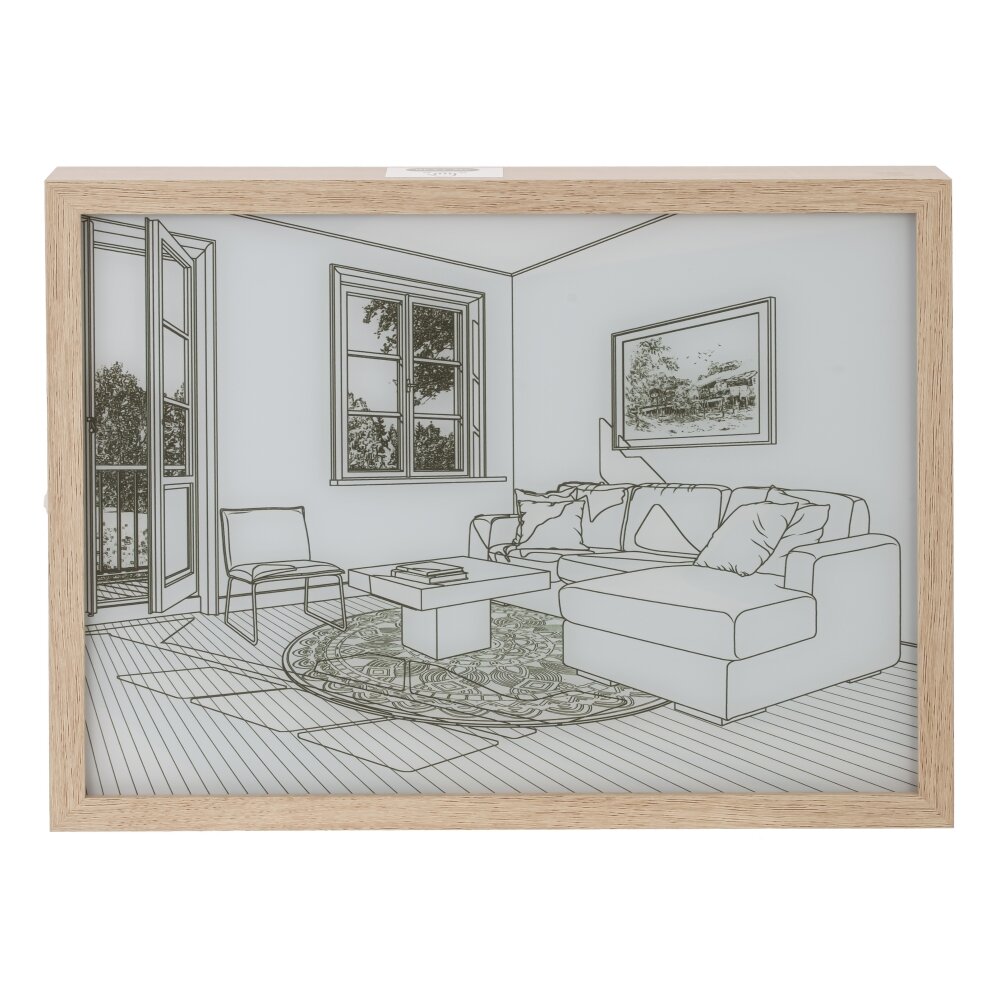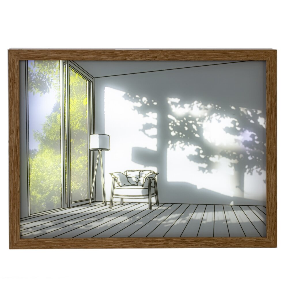 Панно с подсветкой, выполненное из дерева, полимерных материалов, металла и картона, представляет собой оригинальный декоративный объект для современного интерьера. Размер изделия составляет 31 ? 4 ? 23 см. На поверхности панно изображена изящная графическая сцена уютной гостиной с мебелью, окнами и элементами декора, а также минималистичный интерьер с креслом и торшером. Благодаря встроенной USB-подсветке панно не только украшает пространство, но и создает мягкое, приятное освещение, подчёркивая линии рисунка. Такой элемент декора будет прекрасно смотреться в гостиной, спальне или рабочем кабинете, добавляя уюта и индивидуальности вашему дому. Представлено в двух вариантах.