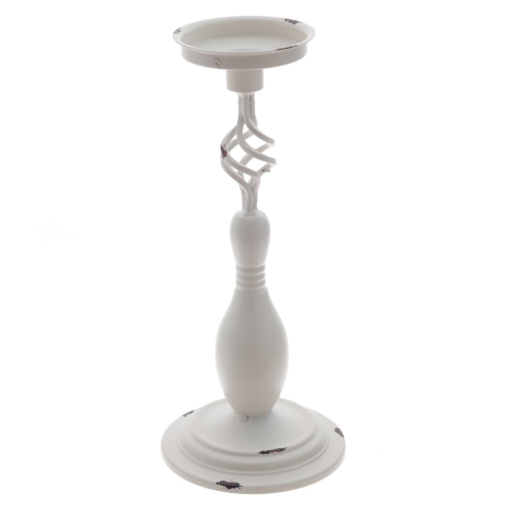 Подсвечник для одной свечи диаметром 2 см изготовлен из металла и имеет белое покрытие с эффектом состаривания. Его изысканный дизайн с винтажными деталями позволяет гармонично вписаться в разные стили интерьера — от традиционного до ультрасовременного.