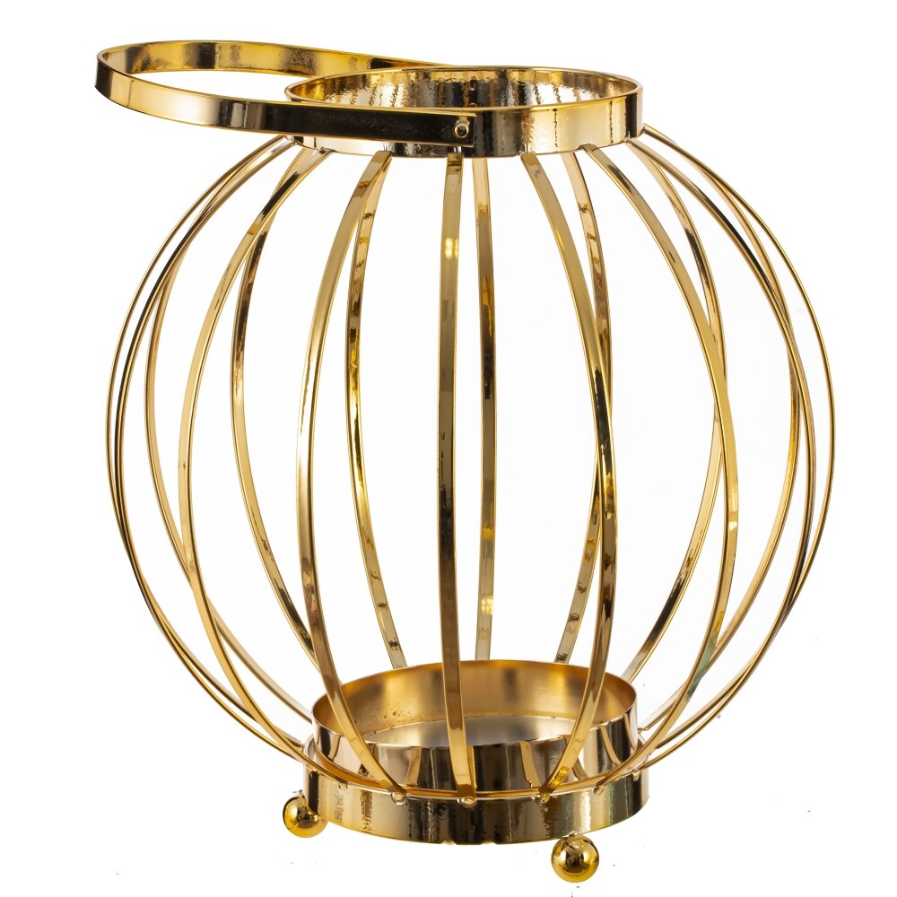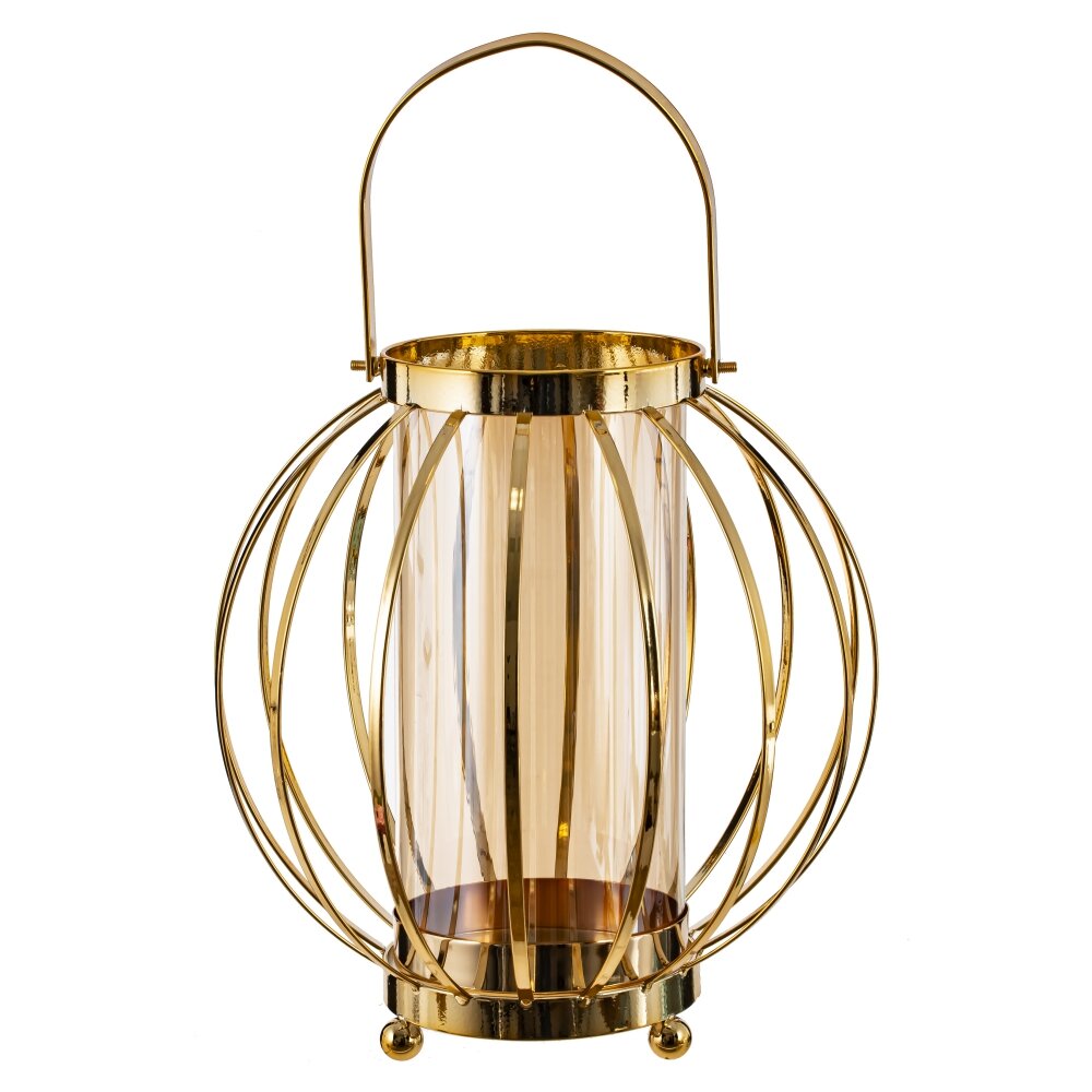 Элегантный подсвечник из металла и стекла. Зеркально?золотистая рамка образует округлый каркас с изогнутыми ребрами, внутри — цилиндрическая стеклянная колба теплого, медово?янтарного оттенка. Верх и низ закреплены на широкой металлической окантовке, снизу — небольшие шарообразные ножки для устойчивости. Удобная дугообразная ручка позволяет переносить и подвешивать изделие. Колба надежно защищает пламя от сквозняков, усиливая мягкое свечение и игру отражений. Идеален для интерьерного декора, террасы или праздничного стола; подходит для таблеток, греющих и небольших столбиковых свечей. Стиль — современная классика с нотами ар-деко.