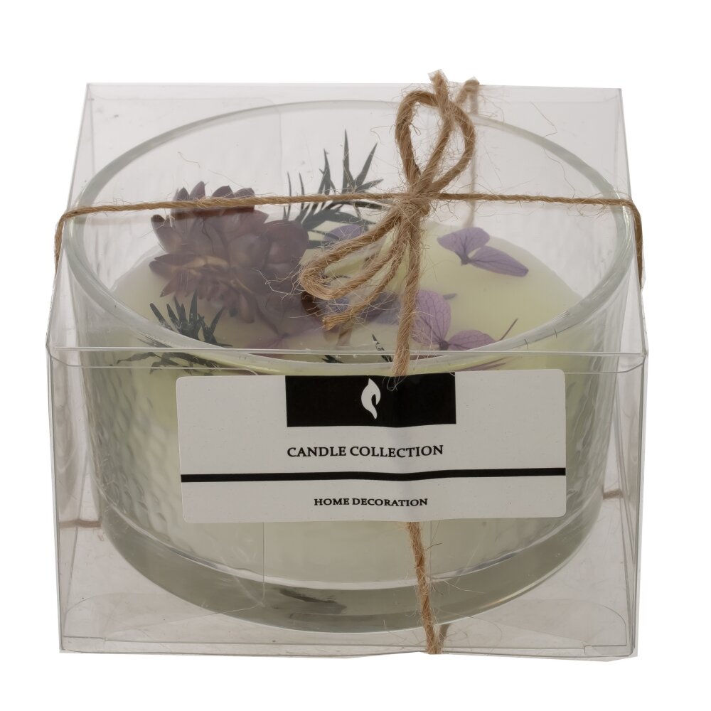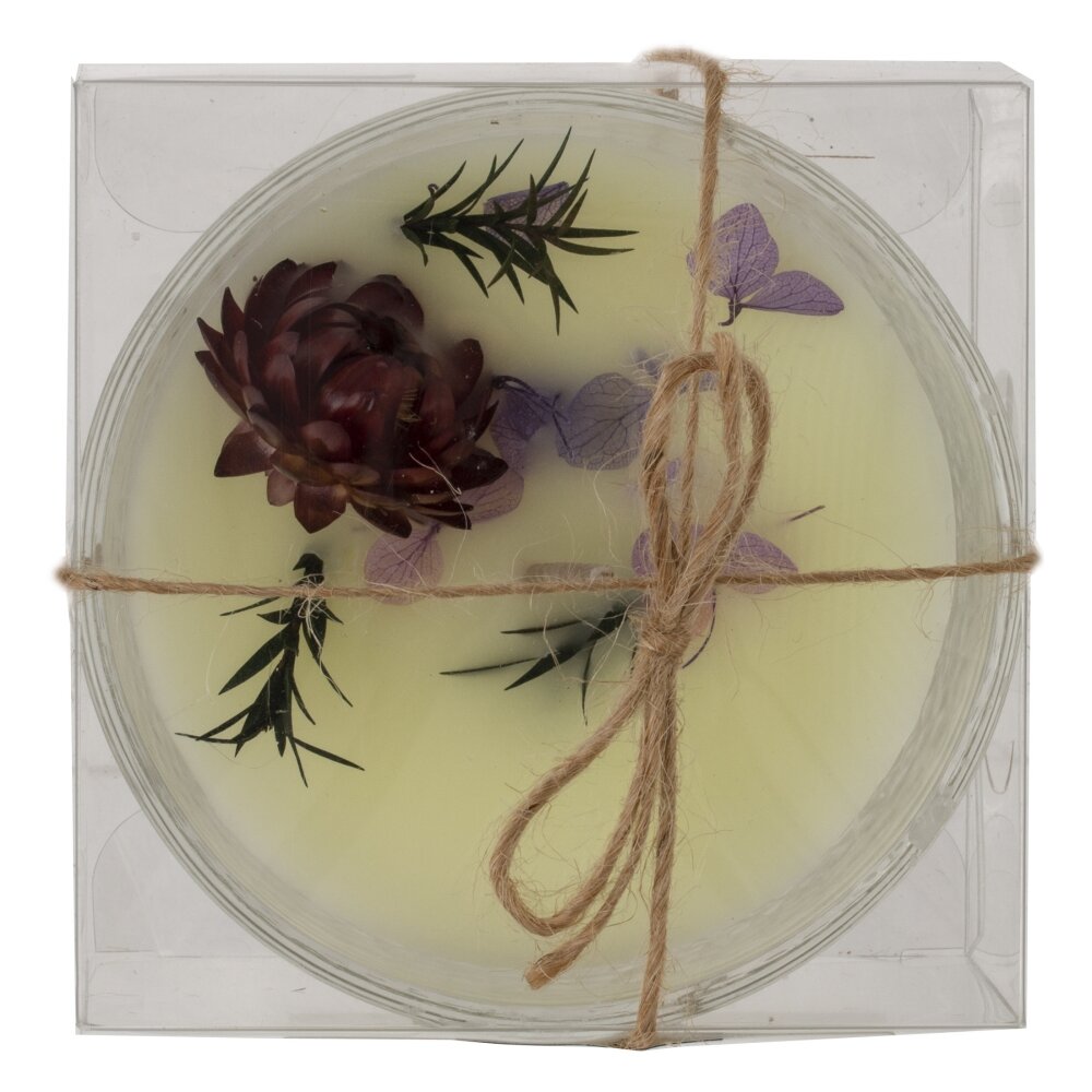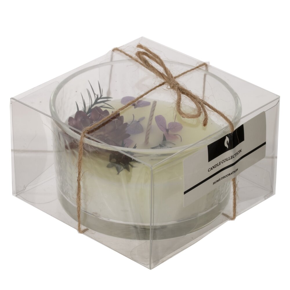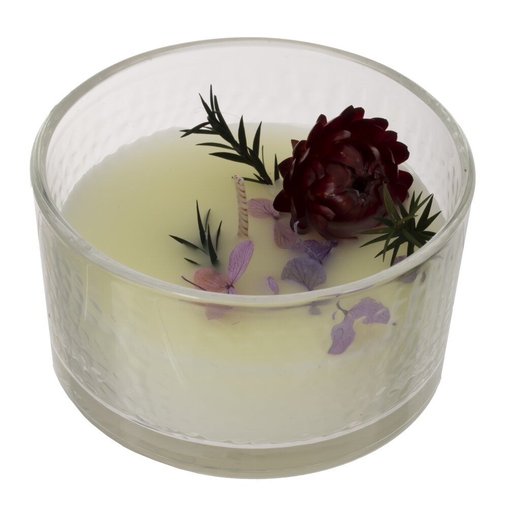 Ароматическая свеча в низком прозрачном стакане из фактурного стекла, диаметр 8,5 см. Основа — качественный парафин нежно-кремового оттенка. Верх украшен сухоцветами: бордовым бутоном, сиреневыми лепестками и зелеными веточками, создающими изысканную мини-композицию. При горении теплый свет красиво преломляется в стекле, наполняя комнату уютом и легким природным ароматом. Компактный размер удобен для спальни, ванны или гостиной, уместен для релакса и романтических вечеров. Материалы: парафин, стекло. Рекомендации: подрезайте фитиль до 5–7 мм, ставьте на жаропрочную поверхность и не оставляйте без присмотра. Отличная идея для подарка и стильного декора.