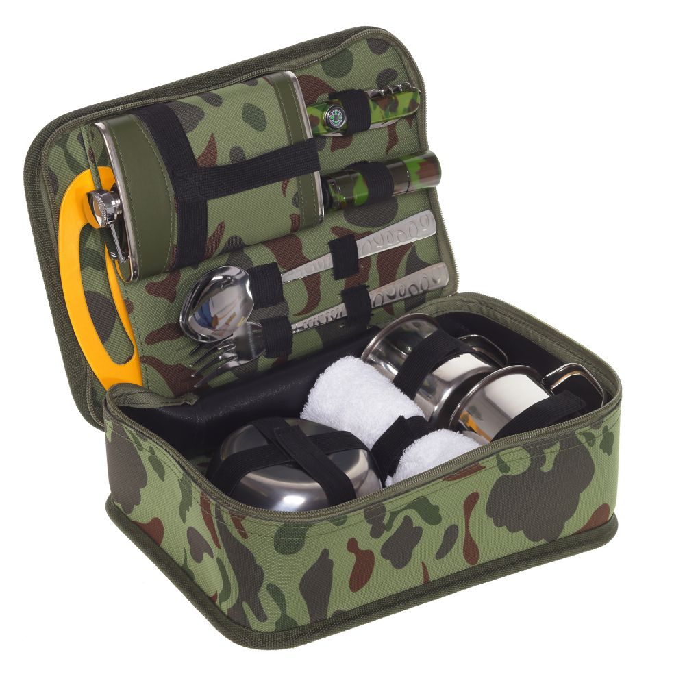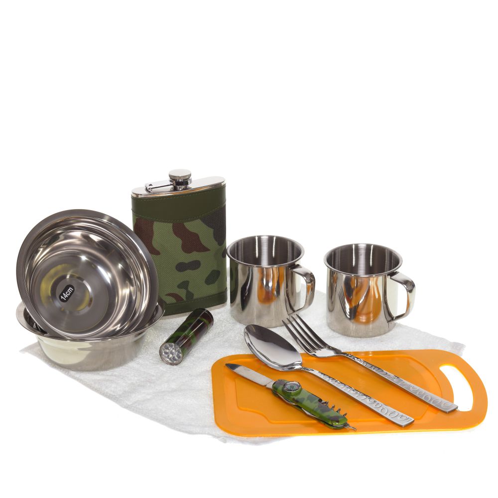 Набор для пикника 11 предм. (фляжка 270 мл, 2 тарелки, 2 кружки, ложка, вилка, доска раздел., фонарь