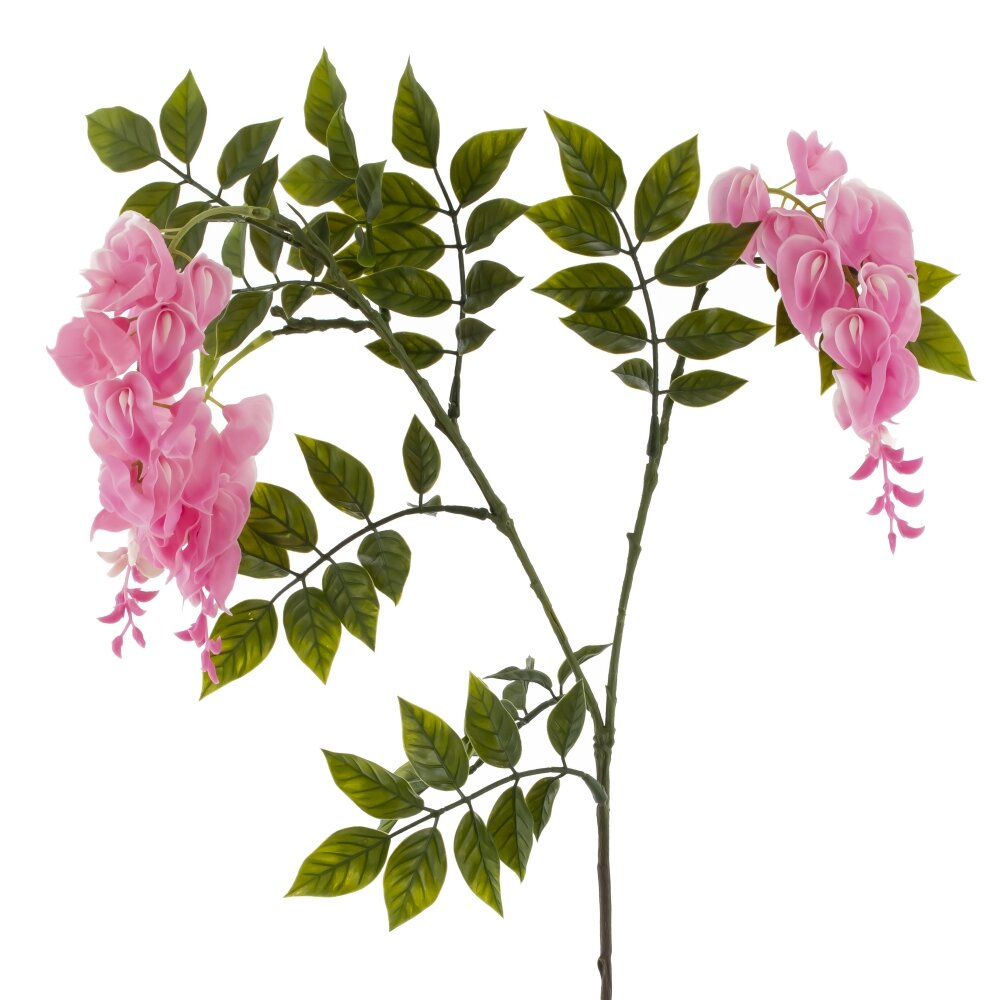 Искусственная глициния — изящная ветвь с несколькими ниспадающими кистями нежно?розовых цветков и насыщенно?зелёной листвой. Лепестки выполнены из качественных полимерных материалов, сохраняют форму и цвет, не требуют полива и особого ухода. Стебли усилены металлической основой, поэтому ветка легко принимает нужное положение и надежно удерживает форму в композициях. Подходит для интерьера, витрин, фотозон и праздничного оформления. Для ухода достаточно периодически протирать пыль сухой салфеткой.