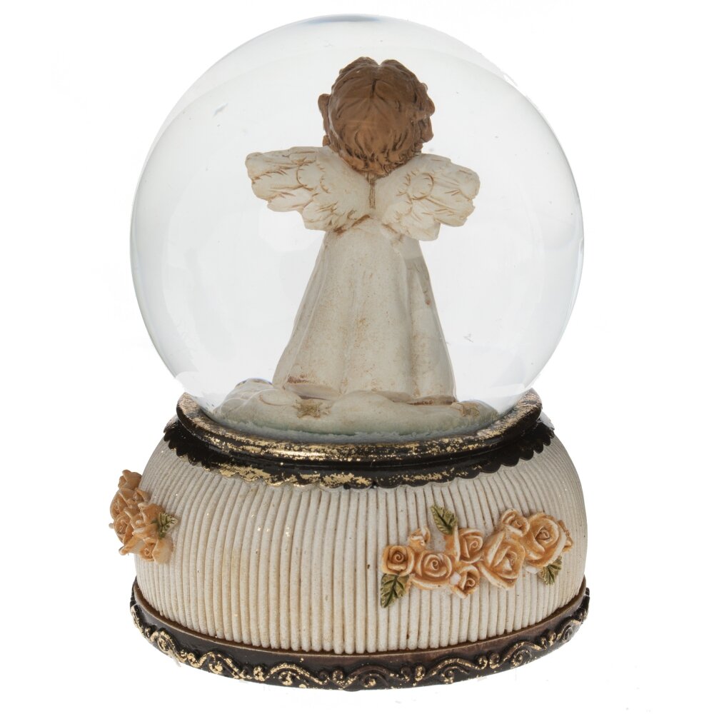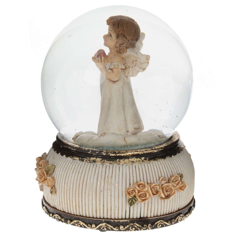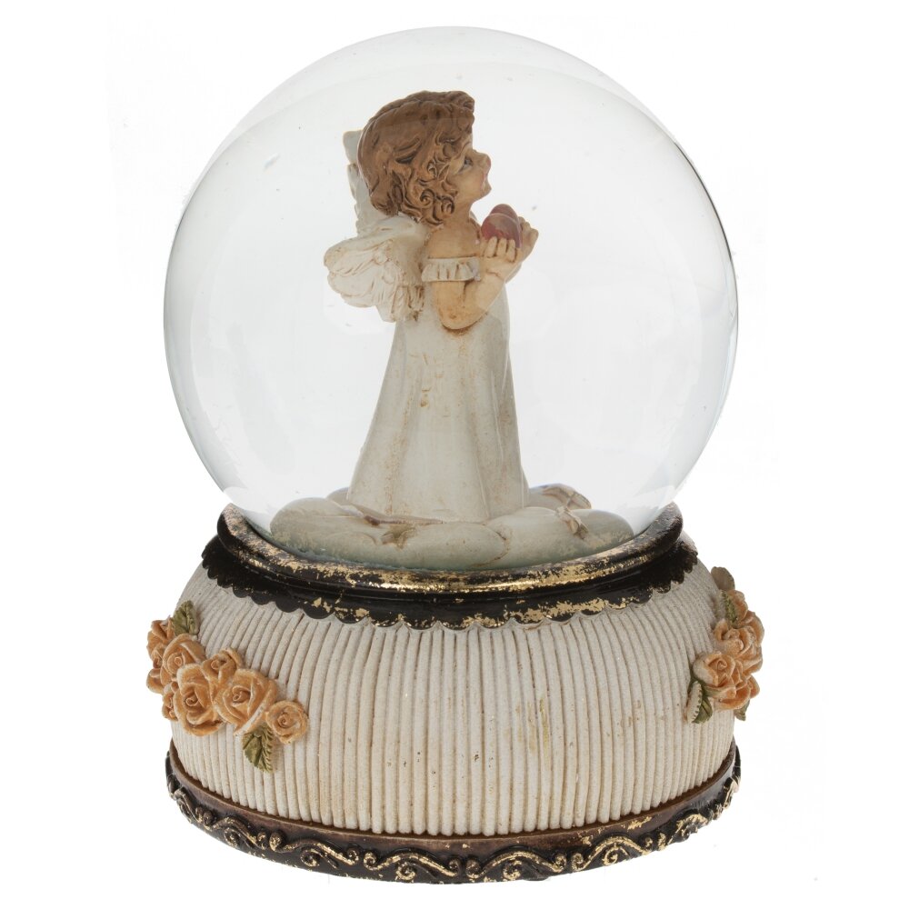 Превосходная фигурка в стеклянном шаре "Ангел" добавит нежности и волшебства в ваш интерьер. На изящной подставке, украшенной розами, расположен шар диаметром 10 см. Внутри шара - милая девочка-Ангел, нежно держит розовое сердечко, символизирующее любовь к миру. Заводной ключик находится снизу изделия. При заведении начинает играть приятная рождественская мелодия, наполняющая помещение волшебством праздника. Если потрясти шар, то белые хлопья снега медленно закружатся внутри, создавая иллюзию сказочного зимнего дня.