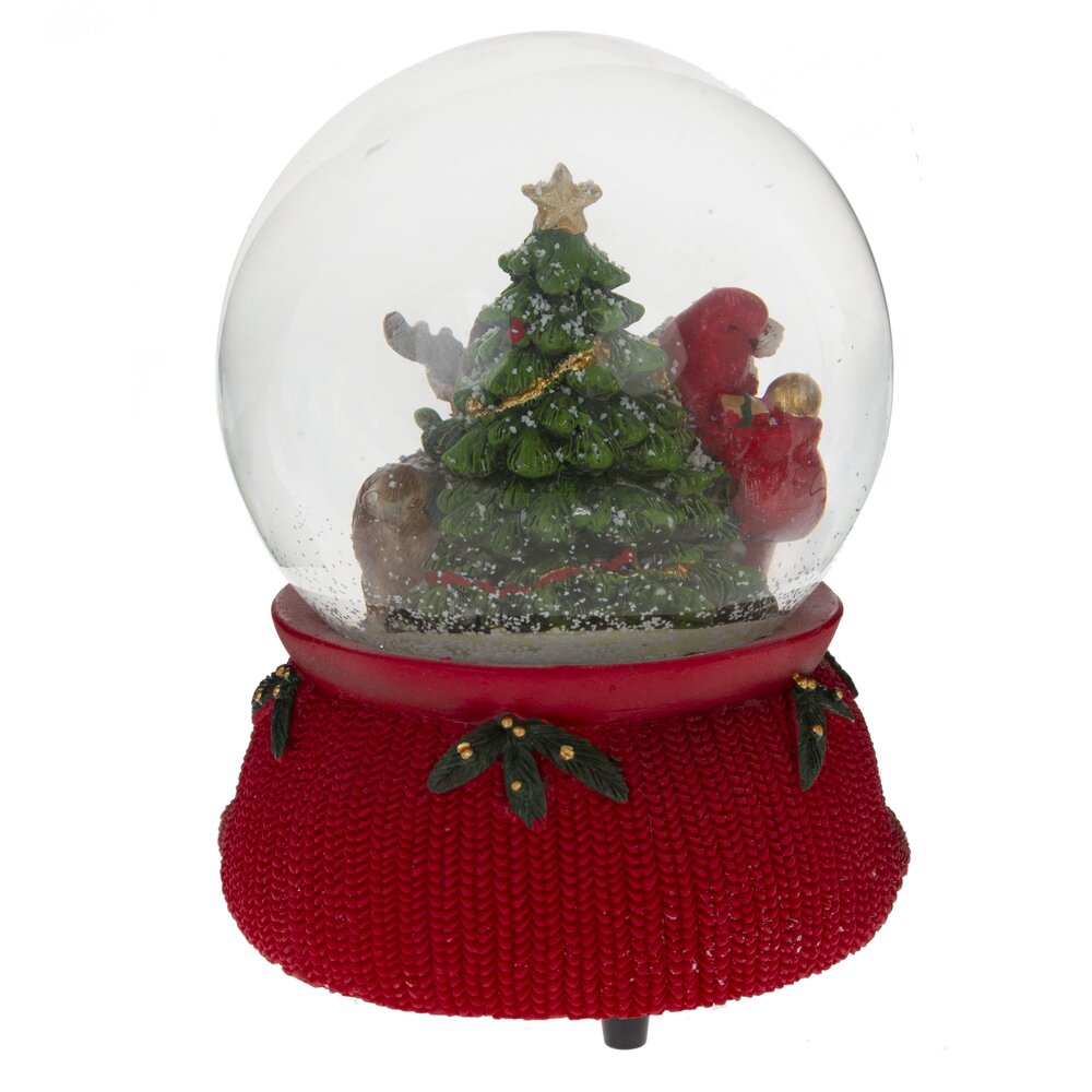 Стеклянный шар, диаметром 10 см, заполнен водой с белыми хлопьями, имитурующими снег при встряхивании. Фигурки и подставка изготовлены из полистоуна с любовью к деталям. Снизу подставки расположен заводной ключ, при повороте которого проигрывается мелодия "В лесу родилась елочка".